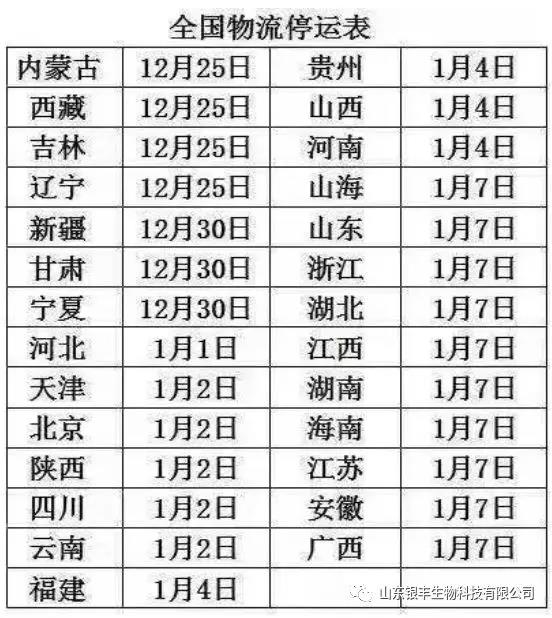 我們知道三甲胺的上游原料為甲醇和液氨,甲醇的上游是煤炭。環氧乙烷的上游是乙烯,乙烯的上游是石油。都是廣泛應用的大宗化工品,在國民經濟中占有重要地位。在康波經濟周期衰退的大背景下,在中美貿易摩擦仍然沒有停止的小背景下,作為基礎化工品甲醇、液氨的使用消耗必然受到抑制(環氧乙烷也是如此),價格下跌。那么作為甲醇和液氨下游的三甲胺價格出現下跌也是順其自然、合情合理的。但價格再低也是有成本在那里擺著,目前三甲胺已經在5500-5700元/噸這個三年以來的最低價格區間運行了將近一個月的時間,這樣的狀態會一直持續下去嗎?筆者認為概率很低,目前三甲胺廠家普遍處于虧損狀態,并且從12月初開始,山東某最大廠商已經開始每天減產50-60噸,產量降幅20%,限產挺價意愿強烈。隨著貨源收緊,作者認為后期三甲胺價格上行將是大概率事件,需要保持密切關注。 進入到2019年的最后一個月,北京迎來初雪,南方的寒風也開始吹起。當大家都在感嘆“冬天,終于來了”時,物流運輸業就開始躁動起來。除了受大風大雪天氣影響,此前江蘇高架橋側翻引發的全國運輸安全大排查(導致運輸車輛不敢超載)和《危險貨物道路運輸安全管理辦法》的發布,都導致物流運輸價格水漲船高。2020年春節恰巧在2020年1月份,新年就這么毫無防備的來了,距離春節還有一個多月的時間,當下可以說是“年關臨近”了。最近山東、河北、江蘇、湖北、湖南、上海、安徽、內蒙古等27個省份地區所在的物流部門發布了春節期間的物流停運通知,根據通知顯示,從2019年12月25日起,物流運輸將會陸續停運(可以參考網上流傳的全國物流停運表)。 從上圖可以看到,內蒙古、西藏、吉林、遼寧等地12月25日就開始停運,距離現在還有半個月的時間;停運最晚的山東、浙江、上海等省市物流運輸最晚截至到1月7日,滿打滿算還有1個月的發貨時間。而且越到最后運輸車輛就越難找,運輸費用也越高,所以發貨還是要盡量提前安排。 近期氯化膽堿價格在谷底底部區間運行特征明顯,下跌概率很低。<strong helvetica="" neue",="" "pingfang="" sc",="" "hiragino="" sans="" gb",="" "microsoft="" yahei="" ui",="" yahei",="" arial,="" sans-serif;="" font-size:="" 16px;="" letter-spacing:="" 0.544px;="" text-align:="" justify;="" white-space:="" normal;="" background-color:="" rgb(255,="" 255,="" 255);="" box-sizing:="" border-box="" !important;="" overflow-wrap:="" break-word="" !important;"="" style="box-sizing: border-box; margin: 0px; padding: 0px; max-width: 100%;">受三甲胺限產保價政策的影響,價格上漲將是大概率事件,我們分析的表現形式為窄幅度多頻率。山東銀豐在此提醒廣大采購商和經銷商,根據自身庫存條件,合理安排訂貨及發貨時間,特別是運輸距離較遠的,務必要提前做好準備,避免因物流配貨、惡劣天氣及貨物供應問題而導致的被動局面出現。