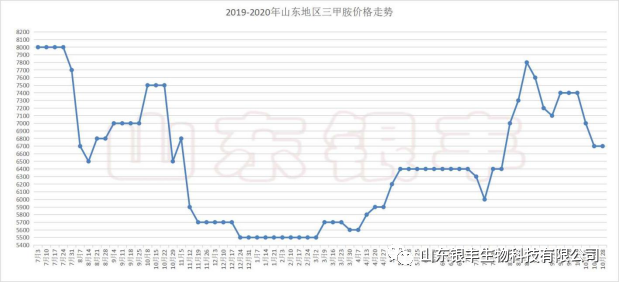 三甲胺方面,由于三甲胺關聯產品DMF銷量受阻,下游跟進力度減弱,導致價格一降再降,加之冬季環保審核力度的加大,對廠家生產造成了一定的影響,多方面原因導致各廠家生產負荷相應降低,連帶三甲胺出貨量也相對減少,庫存量處于低位,廠家限量保價意愿強烈。目前山東地區三甲胺市場主流出廠成交價格參考6700-7200元/噸,自11月底至今,三甲胺市場價格接連上漲300元每噸,但在三甲胺產量低位,下游膽堿廠家需求等方面的共同促進下,預計三甲胺價格仍有上升空間。