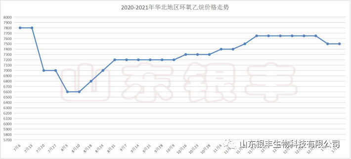 其次是環(huán)氧乙烷方面,國內(nèi)環(huán)氧乙烷市場主流參考報價位于7450-7500元/噸。截止1月12日,國內(nèi)環(huán)氧乙烷報價平穩(wěn),亞洲乙烯市場行情維穩(wěn),CFR東北亞報價1055-1065美元/噸,CFR東南亞報價990-1000美元/噸。裝置方面,12月31日,奧克化學(xué)20萬噸環(huán)氧乙烷裝置不可抗力停車,具體恢復(fù)時間待定。三江化工1月12日停一套6萬噸裝置,開車時間不詳。1月5日,占世界主要生產(chǎn)環(huán)氧乙烷8.25%的陶氏化學(xué)突然宣布不可抗力,預(yù)計不可抗力將持續(xù)到今年10月低。多套環(huán)氧乙烷裝置檢修,原料東北亞乙烯價格處于高位運行,對環(huán)氧乙烷成本支撐力度強勁,據(jù)統(tǒng)計,春節(jié)前仍有多套環(huán)氧乙烷裝置正值檢修狀態(tài)或者計劃檢修,環(huán)氧乙烷價格年前或?qū)⒁跃S穩(wěn)為主,但下游聚羧酸減水劑單體市場交投清淡,新單價格不斷走軟,需求面無利好支撐,隨著年后環(huán)保政策放寬,廠家檢修結(jié)束,價格維穩(wěn)是關(guān)鍵。