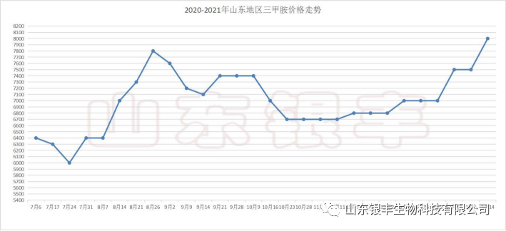 首先是三甲胺方面,上期文章中有提到,隨著春節(jié)將近,政府整治環(huán)保行動不斷嚴(yán)格,全國多地都相繼出臺關(guān)于化工以及煤炭等高污染行業(yè)的停電限產(chǎn)政令。加之近期最基礎(chǔ)的原料煤炭受河北,山西疫情嚴(yán)控,物流運輸受到限制,煤炭到貨量減少,致使化工企業(yè)生產(chǎn)受限。受此影響,對三甲胺供應(yīng)面造成進一步壓縮,產(chǎn)量不斷減少,價格也相應(yīng)水漲船高。近期三甲胺價格以50至100元每噸的價格連續(xù)多次跳漲,目前三甲胺主流出廠成交價格參考8500元/噸,較上期文章發(fā)表后已累計漲幅達900元/噸。就當(dāng)下情況而言,在膽堿廠家需求正旺及三甲胺出貨依舊緊張的雙重壓力下,三甲胺價格繼續(xù)不斷上漲依舊是大概率事件。