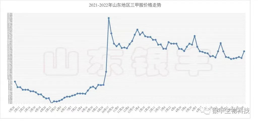 我們來對照一下9月20號以來的實際市場表現:三甲胺在9月20日報價14200元/噸,此后連續一周處于穩定狀態價格未動。9月28日,價格調整為14400元/噸,國慶節后第一天,三甲胺提價到15000元/噸,10月9日三甲胺報價15500元/噸,短短兩天價格連續跳漲了1100元。氯化膽堿在成本承壓下,價格梯次上行,再次驗證了上期銀豐資訊的分析觀點。