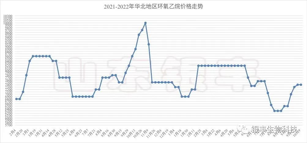 再來看環氧乙烷走勢情況。9月初開始,環氧乙烷在成本承壓和市場供應緊張的情況下,價格從月初的6500元/噸一路上漲。截止到9月22日,環氧乙烷報價在7400元左右。9月26日開始,東北亞乙烯開始下跌40美元/噸至900美元/噸。9月30日,東北亞乙烯價格下調之850元/噸。成本面對環氧乙烷的支撐作用減弱。從供需層面看,供應端近期環氧乙烷供應量增加,部分前期停車的裝置開始復產,另外還有部分裝置重啟預期較濃。需求段,下游聚羧酸減水劑單體行情偏弱,價格小幅回落,對高價的環氧乙烷開始敏感。預計短期內環氧乙烷價格或將弱勢橫盤震蕩為主,后市觀望供應端增量變化。不過相對于三甲胺跨步式的價格波動,目前環氧乙烷對氯化膽堿價格影響有限。